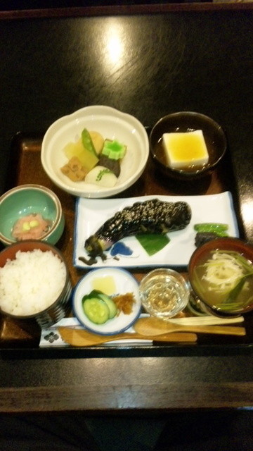 内容は御膳に右上からレンコンの和えもの、野菜の煮合わせ、胡麻豆腐、茄子の田楽、御飯、漬物、榎木茸の味噌汁それに食前酒といった内容。