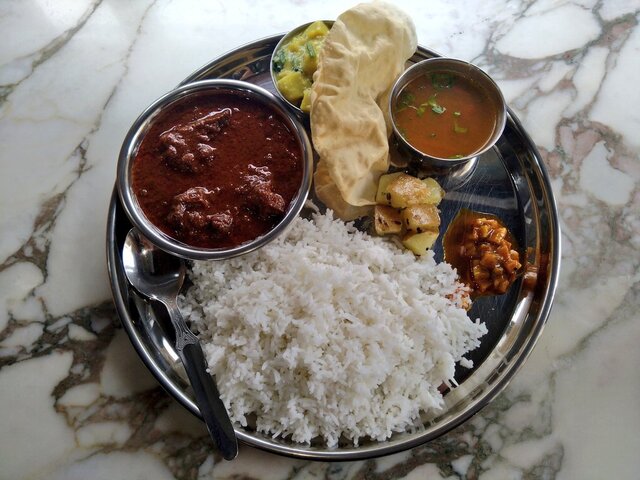ポークヴィンダルー、クートゥー、ラッサム、ポリヤル、ウールガイ、アッパラム、バスマティライスがワンプレートで提供されます。