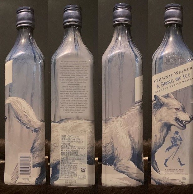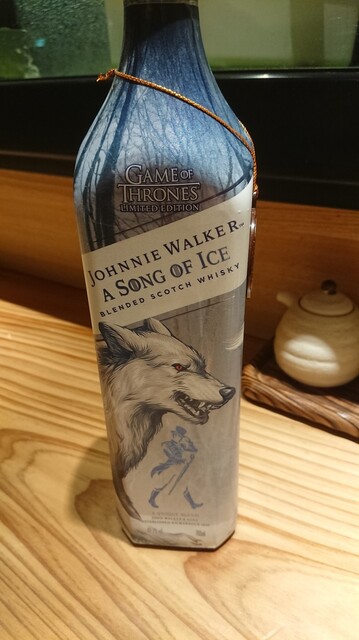 後、珍しいボトルがあったので、仕入れしておいてくれた。ジョニーウォーカーのアソングオブアイスというスコッチで、4本並べると、狼の姿が映し出されます