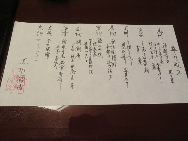 手書きの献立表が添えられていますので、詳細は画像の方でお料理と一緒にみて頂ければと思います。