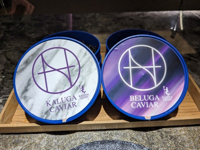 こちらのお店のロゴ入りのケースに入った2種類のキャビアを使用されています。