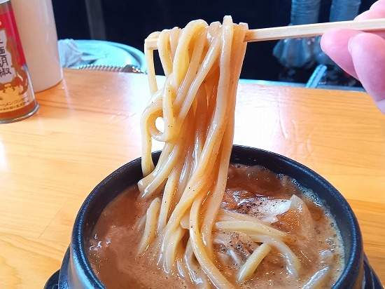 極太麺を、グツグツと煮えたぎるつけダレで頂きます。