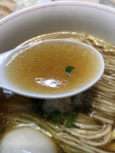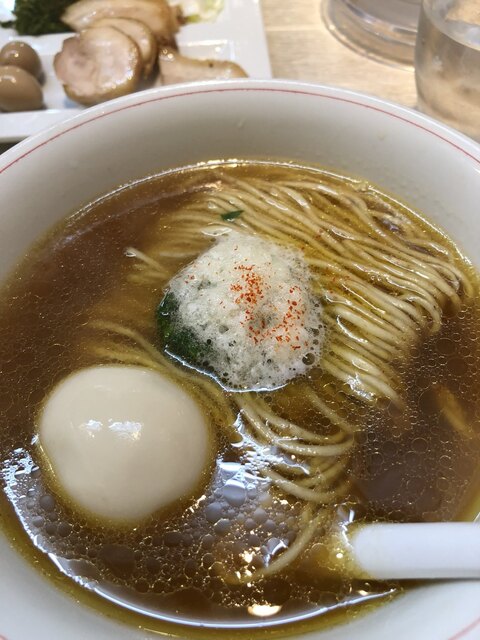 今日は初めて稲庭中華そばを注文しました。スープはいつも通りですが、鶏、豚足等のコラーゲンとカツオ、サバ等の魚介のダブルスープ。これに枕崎の本枯れ節を加えて、サイフォンでじっくり出汁を取ったもの。滋味深く、とても美味しい!そして稲庭うどんのような麺がツルツル、それでもコシがない訳ではなく、スープと一緒に啜ると、これは美味い!煮干しとカツオのエスプーマも味変になりました。