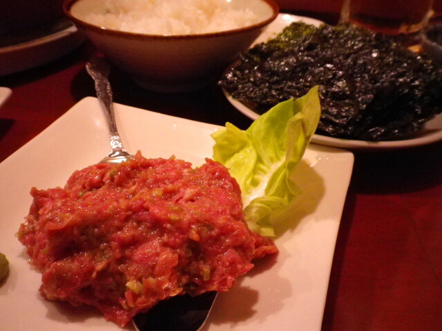 なるほど韓国のりの塩味がユッケにあうし