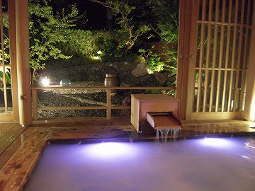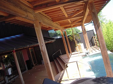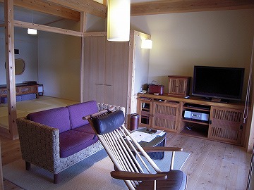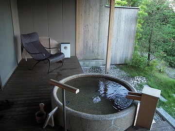 お庭に露天風呂と檜の内風呂 、梁を活かした高天井の60平方メートルの客室です。