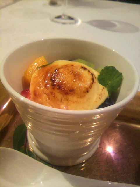 ココナッツ風味のフルーツのグラタン仕立てライチのジュレ