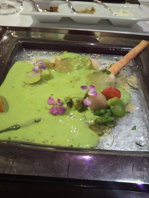 丹沢の丸沢の野セリとグリーンスープとムース貝のジュレ