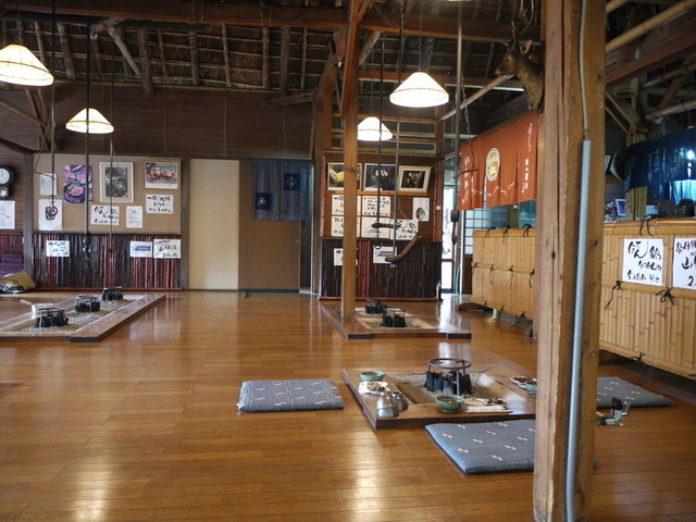 茅葺き屋根の中、囲炉裏の側で頂くぼたん鍋。