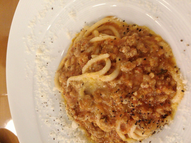 前菜をいただきながら生ビールと赤ワインをいただく、しばらくするとパスタが運ばれてきた。