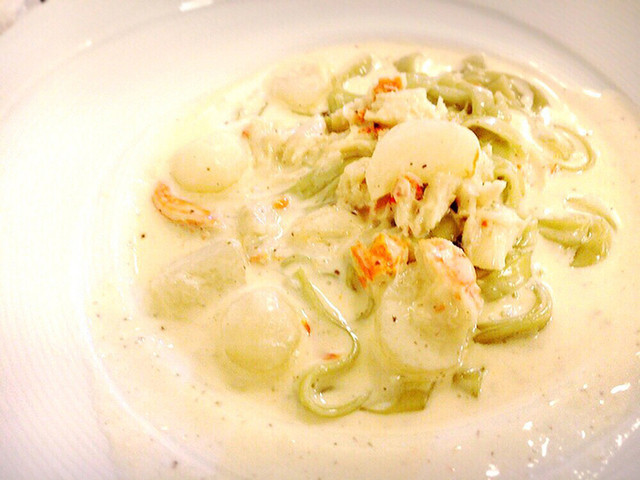 紅ずわい蟹、かぶのクリームソース、ほうれん草を練りこんだタリアッテッレ
