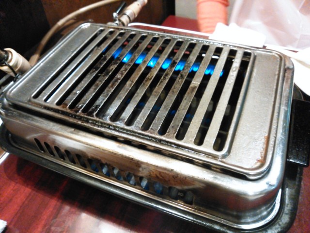 テーブルの上には昔ながらのガスの焼き台が設置されています。