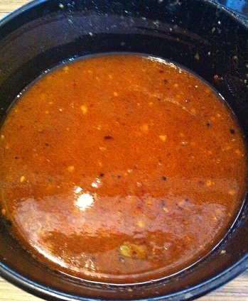 つけ汁は濃厚な味噌の風味とラー油などの辛さが混ざり合って