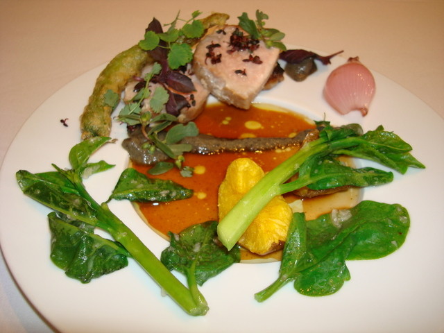 鴨にシェリービネガーソースがタップリかけられており、天使のキャベツ・プチベール・ミドリダイ