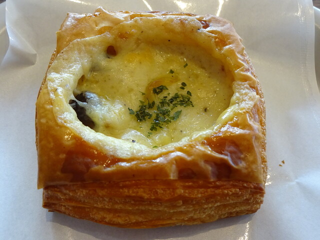デニッシュの中央部にキノコ等の具材を含むグラタンを配した品です。
