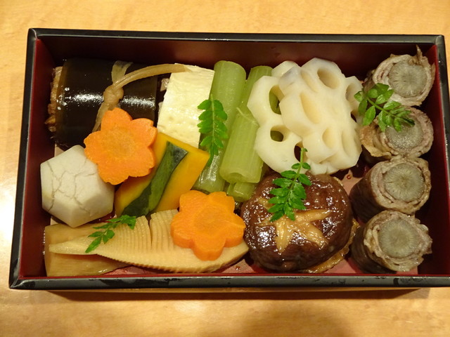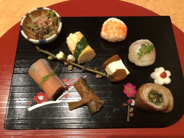 クワイの含め煮、黒毛和牛のローストビーフ、穴子の昆布巻き、前沢牛の八幡巻き、