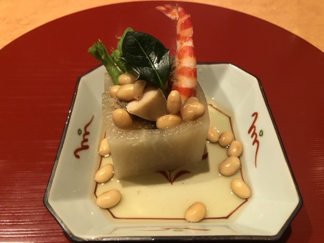 揚げたタケノコを煮浸しにした品に擦りおろし大根・大豆を添えた品です。