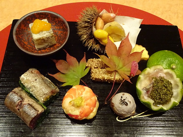 鹿児島産車海老炒り煮、本木内より鮭塩焼き、鮑の旨煮、道南産五寸筍、里芋、九州
