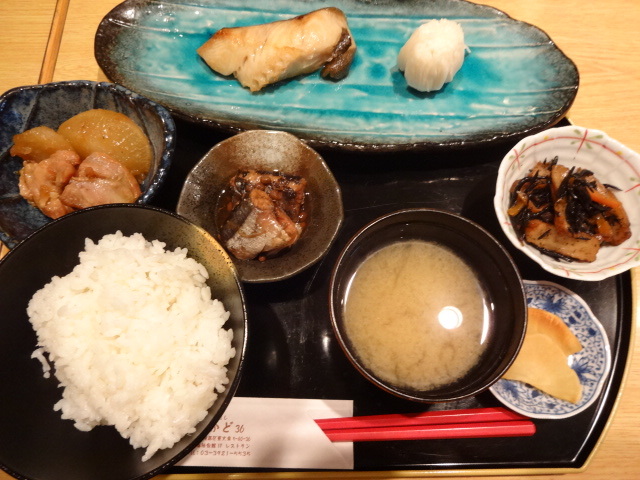 構成は、銀だら+ご飯+ミソ汁+小鉢3品+お新香です。