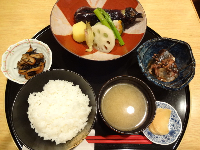 構成は、メイン+ご飯+ミソ汁+小鉢2品+お新香です。