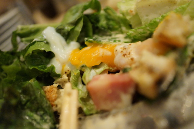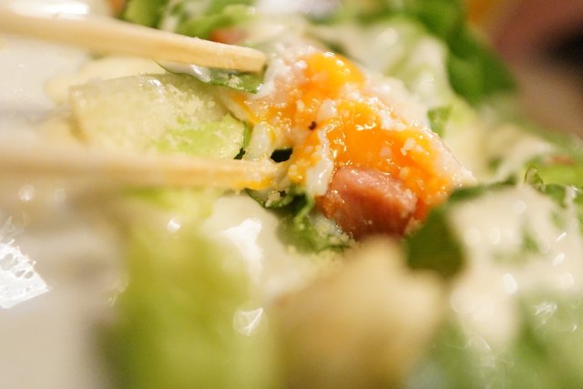 ざっくばらんに盛られた野菜に厚切りベーコンと温玉、シーザードレ