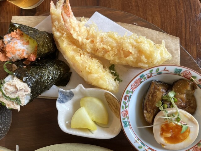 私は大海老のセットで、海老天2匹、おにぎり2個に小鉢付きの蕎麦♡