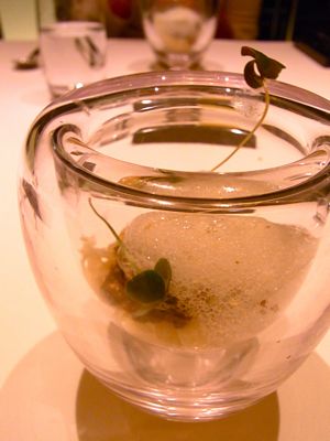 喰い気にレポが全然追いつかない為、記憶に残っているお皿だけまとめてメモハルマキじゃないよー(笑)まだ太陽がじりじりと容赦なかった頃、フロリレージュでいただいた鮎のフリットに感動!香り高きとりふ、爽やかな胡瓜のジュレ、そして主役はさっくりとふっくらと…おやまあ何と立派な鮎。花菱の純米大吟醸赤ラベルと合わせるシアワセ枠にとらわれない柔軟な組み合わせは流石デス。この後に続いたシャラン産ビュルゴー家のカモちゃんも、ランチで出していただくにはあまりに素晴らしい一品でござったシメはお店の名と同じコニャックで☆コチラは、もう少し涼しくなってからいただいた鰻とファアグラのミルフィユ。ウナギっつーとどうしてもカバヤキのイメージが捨てきれなかったのだが、勇気を出して頼んでみたら、、、スミマセン、、ハンパなく旨いっすコレ。。先程の鮎とコチラの鰻は「フォアグラとメレンゲ」に匹敵する…いやもしかしたらそれ以上のすぺさりてなんじゃないだろーか!?久しぶりのでなーコースは、美人ソムリエールと。枝豆とビール(写真撮るべきだった!>時間が経つと何を食べたか忘れてしまふことが殆どなのだが、(況や飲むと…翌日には忘却の彼方)、此処でいただいたお料理はへべれけカニミソ頭でも殆ど覚えている記憶に残る料理を作るってスゴいよなあ。。あったかいモンブランもフロリの秋の名物也