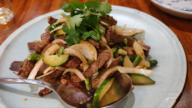早速 牛肉のサラダ、エビのカレー炒めを注文です。