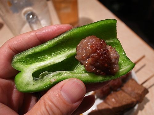 つくねはピーマンに載せて。カリカリのつくねと生ピーマンのシャキシャキ感。ハマる味です。