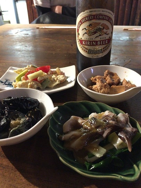 席に案内され、ビールを注文してから、入口近くの大きなテーブルに並んでいるお酒のアテを物色。