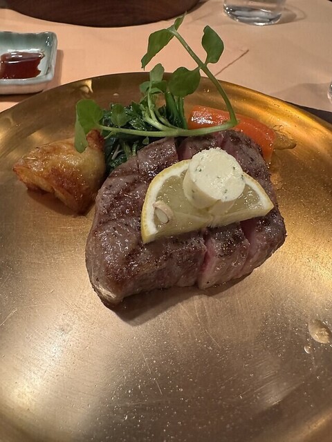 同僚から名古屋最強のステーキハウスと教えてもらった、ステーキハウスキッチンリボン。ディナーはとんでもない金額なので(汗)、ランチタイムに満を持して行ってきました。場所は、市内でも繁華街からは離れたところの住宅街。なぜこんなところに?という場所に、ひっそりとあるお店。 こじんまりとした店内は、老舗の風格。まずは3人で何を食べるが討議。黒毛和牛ステーキランチをそれぞれが、そして、せっかくなので松坂牛シャトーブリアン150gをシェアしようってことで。前菜からスタート。サラダ、そしてスープ。準備万端になったところで、まずは松坂牛の優秀牛が到着。焼き方はミディアムレアで。ナイフで慎重に6等分にカット。な、なんと、ナイフを入れると、すっと切れていく!フツーのステーキを切るのとは明らかに違う感触にびっくり!見事な赤身具合。いただきます。!!!!!口の中ですっととろけていく感触は異次元!これが、松坂牛シャトーブリアンの実力か!焼肉やステーキはよく食べている自覚はありますが、これは人生でほとんど体験したことがない食感。恐るべし。。。続いて、黒毛和牛ステーキランチ。こちらも焼き方はミディアムレア。先ほどのシャトーブリアンと比べると、脂感の強いサシ具合。ピンク色の断面、サシがよく入っている。食べ比べると、肉質がまったく違うことがよくわかる!こちらは、脂感が強くて、ガッツリ肉食べてるなーっていう感じ。食べ比べという、非日常的体験を満喫。そして、食べるとすぐになくなってしまうステーキ涙メロンがデザートに登場。最初から最後までゴージャスなランチ。おそらく、東京で同じものを食べたら、いくらになるのか、恐ろしい…トイレには、某プロ野球選手の写真がありました(笑)彼らがお腹いっぱい食べたら、いくらになるのか、も恐ろしい…(笑)非日常感あふれるひと時でした。またいつか、行ってみたい。