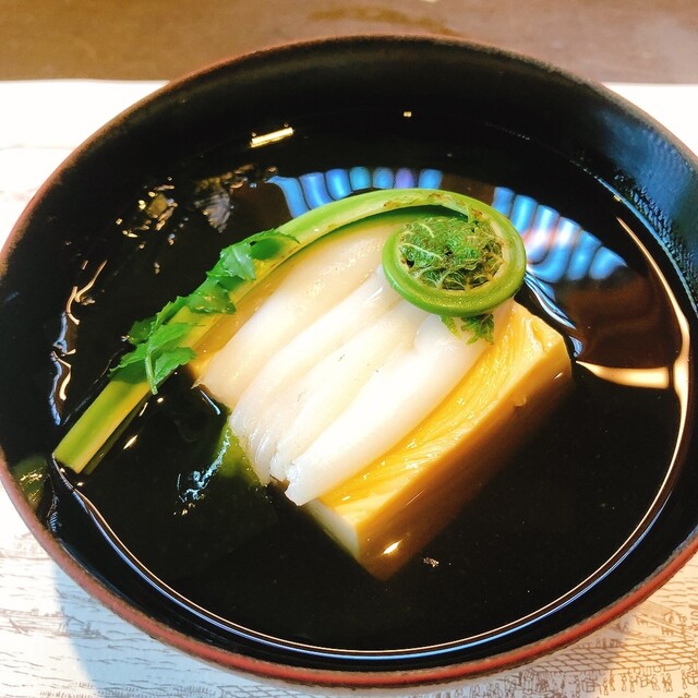 柚子のかおりと海老芋のしんじょがねっちりしていてたまりません。そこに合わさるホタテ。