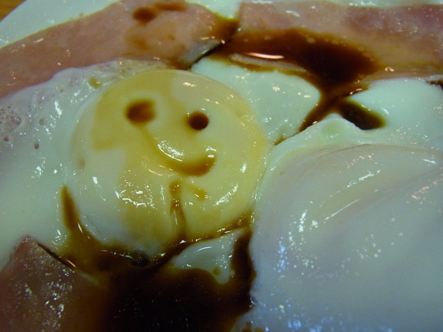 ハムエッグにかけた醤油でニッコリ笑顔が出来ましたね(^^)