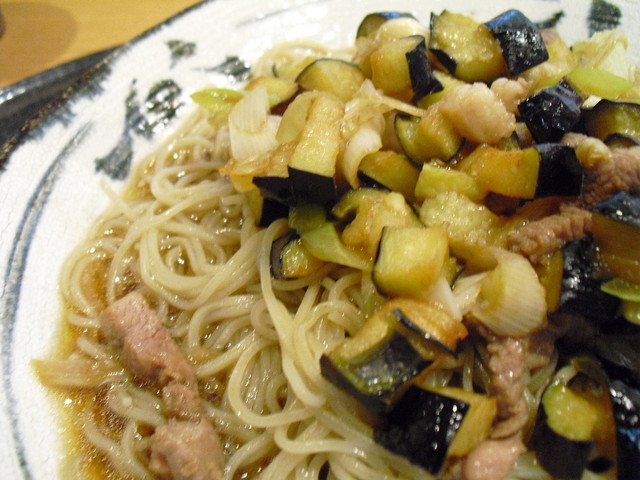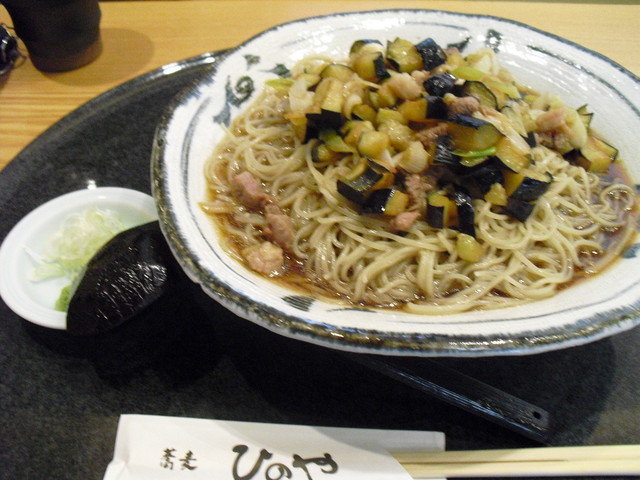 冷たいお蕎麦の上に、きざみ鴨と茄子(素揚げして サイのめに切ったもの)