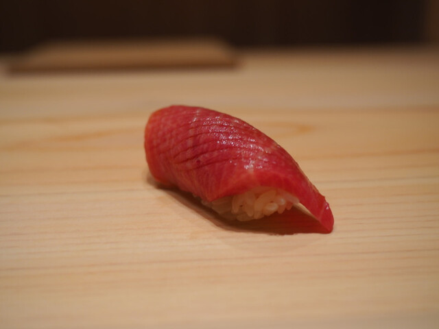 漬けで綺麗ななルビー色が出てきている。鮪らしい酸味しっかり濃い。