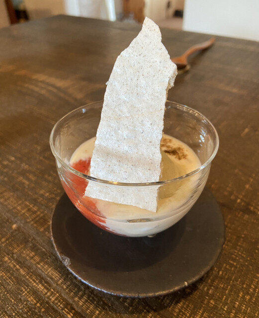黒文字の粉末を練り込んだメレンゲのプレートが印象的。