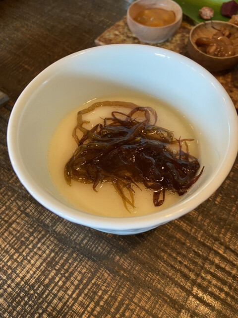 お食事として最初に出てきたのは、ホワイトアスパラのお粥と自家製豆腐。