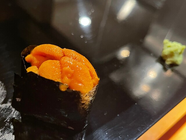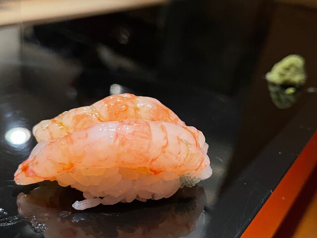 15日ほど前にダメ元で予約電話してみると、時間は短いが17:00スタートだったら二人行けるとのことで予約。当日、ちょっとわかりにくい立地だったが、なんとかほぼ時間通りに到着し、着いた途端に名前を告げて入店。玄関に一番近いカウンターへ。しばらくして、主人の弟子的な、凛とした感じの女性スタッフに聞かれたのは、①握る前につまみは必要か ②必要なら少しでいいか、ガッツリいるか ③つまみに蟹はいるか の3点。連れに聞くと、そんなにたくさんいらないとのことで、つまみ少々、白ワインをグラスで依頼。待ってる間に店内観察すると、照明をおさえた、清潔で和モダンな店内と厨房。カウンターは全部で6席。厨房内はご主人と先述の女性、それに超若いバイトのような女性二名。