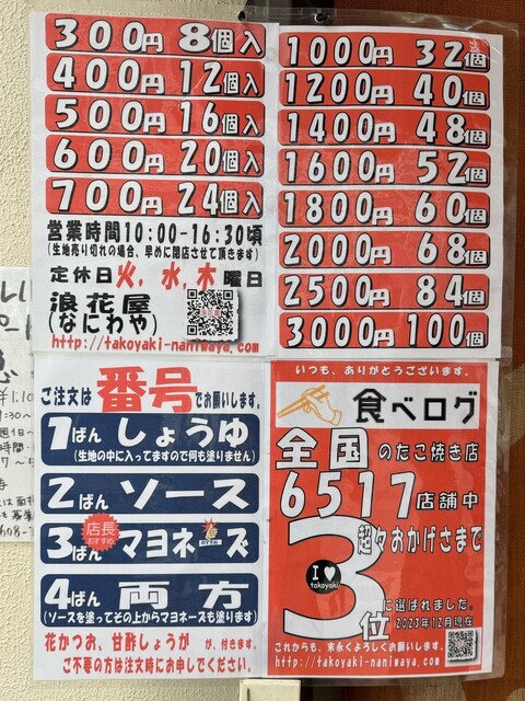 大阪のたこ焼きで一番美味い店はここと複数から聞き、帰省がてら相方と行ってみることに。現地到着は土曜11:50頃で、待ち客10人。20分ほど並んで注文。しょうゆ ソース マヨネーズ 両方 の4種を全て12個400円で注文。持ち帰り仕様で、店内でも食べることを依頼し、注文後入店して着席。並ぶ客は老若男女様々。どうやら予約もできるらしい。スタッフは6人ほどだが、店主は非常に優しい。