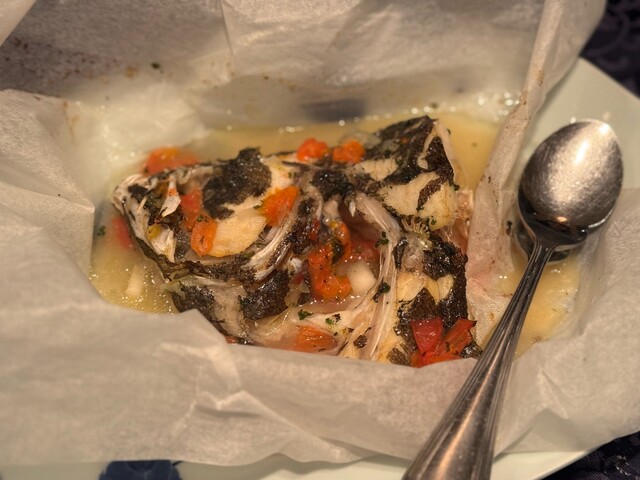 おかみさんの案内で席に着くと、まずは生きた伊勢海老とサザエがお出迎え。そしてそれが半分は刺身となって再登場。プリプリのコリコリ。続いて数種類の魚の刺身が折り重なったカルパッチョ。口の中で魚が混じり合う不思議。以降、楽しく美味しい時が過ぎ、海老に魚尽くしかと思いきや、肉厚ヒラメの後に出てきたのはローストビーフ。ガッツリ派でも十分お腹いっぱいの完食。自家製というパンも、外サックリ中ふんわりで大変美味しい。飲み物は、スパークリング→白→赤2とグラスでいただきました。