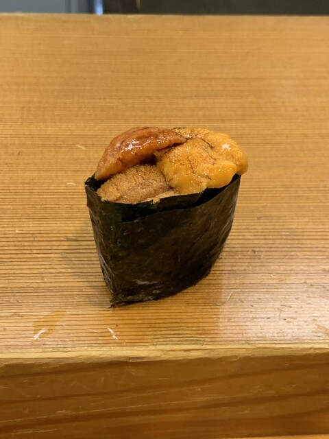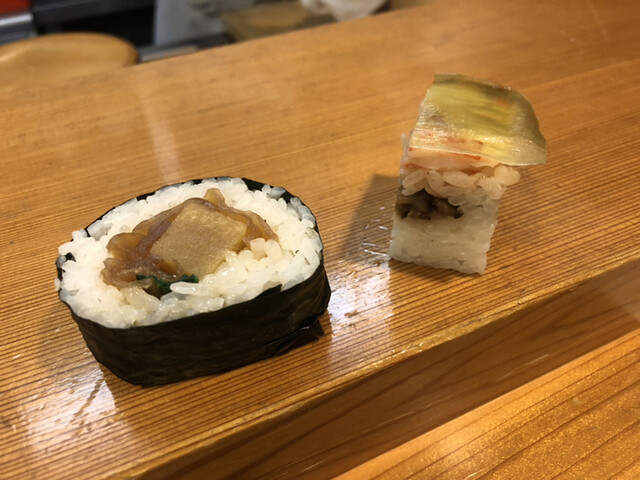 寿司もたいらぎ貝、海老、鯵の巻物?と続き、いつもの通りどれもハズレはありません。アテでいただいたあん肝を軍艦にもしていただきました!玉子と太巻き、赤出汁といただいてコースの終了。