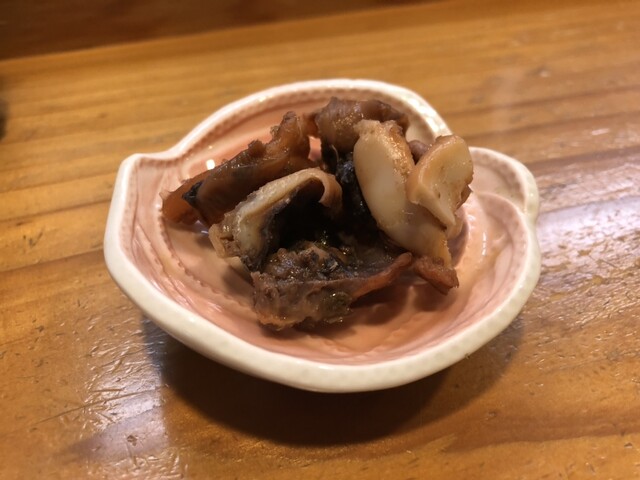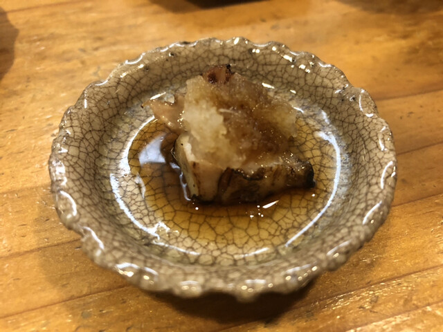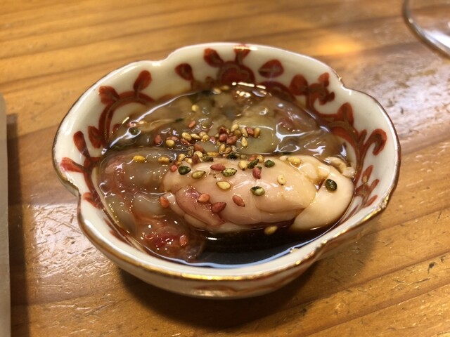 最初のアテは、タコの卵?だったでしょうか。濃いめの出汁に漬けられた珍味ですね。独特な食感を楽しむことができます。続いては牡蠣の登場。しかも2種類( ^∀^)