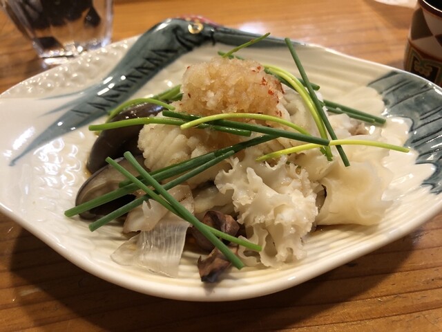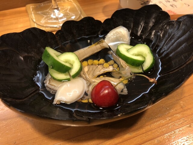 まずは煮牡蠣とナマコから。岡山産の牡蠣だそうです。ネットリ食感がたまらないですね♪ ナマコも久しぶりに食べます!ポン酢にごま油がいいアクセントになっていまさした。