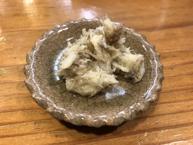 まずはアテからですね。最初はモサ海老から。モサ海老は日本海各地で獲れるのだそう。甘味があってプリプリな食感♪ さらに太刀魚の炙りに、ホタルイカのなめろう、クリ蟹と続きました。