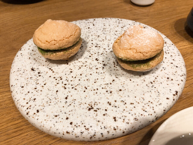 空豆の鮮やかなグリーンと純白のアーモンドムースが綺麗です。かつお節ならぬ鶏節が表面に振りかけられています。空豆の優しい風味が鼻を抜けていきます。