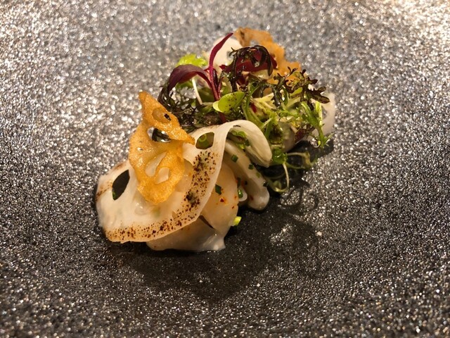 蓮根餅をフレンチで食べられるとは♪ 帆立も肉厚で瑞々しいです( ^∀^) 蓮根餅は独特な歯ごたえがあって、不思議と帆立の食感ともマッチしていました。