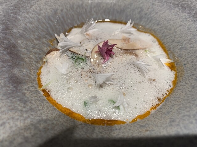 ウフブルイエはクリーミーなスクランブルエッグのことのよう。帆立に絡めながらいただきます。泡泡な帆立のエキスのソースも絶品でした。