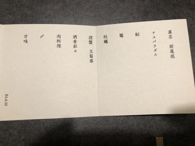 カウンターに着席してまずはビールで乾杯( ^∀^) コース料理一本のみのようで、早速に初めていただきます。コースの内容は以下の通り。