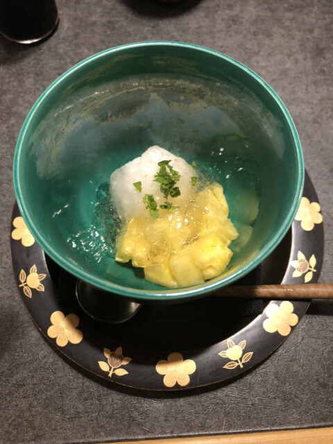 仙鳳趾産の牡蠣。トマト果汁のゼリーにシャーベットといただきました。プリプリ食感で潮の香りと爽やかなシャーベットの風味が合わさって◎。
