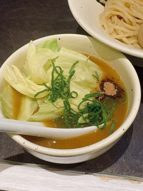 いつも通りのつけ麺!コレ一択。熱々汁のキャベツと鶏肉がお気に入り。他の方は割スープで飲んでいますが、私は割らずにそのままで♪