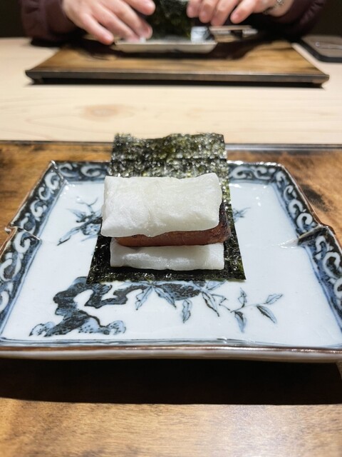 皮目にしっかり焼きが入り、口に含んだ瞬間に香ばしさが口の中に広がる。勿論身には火が入っておらず質の高い伝助穴子のねっとりした食感と共に旨み甘みが。焼き霜とはこう言うことだったのかと目から鱗。